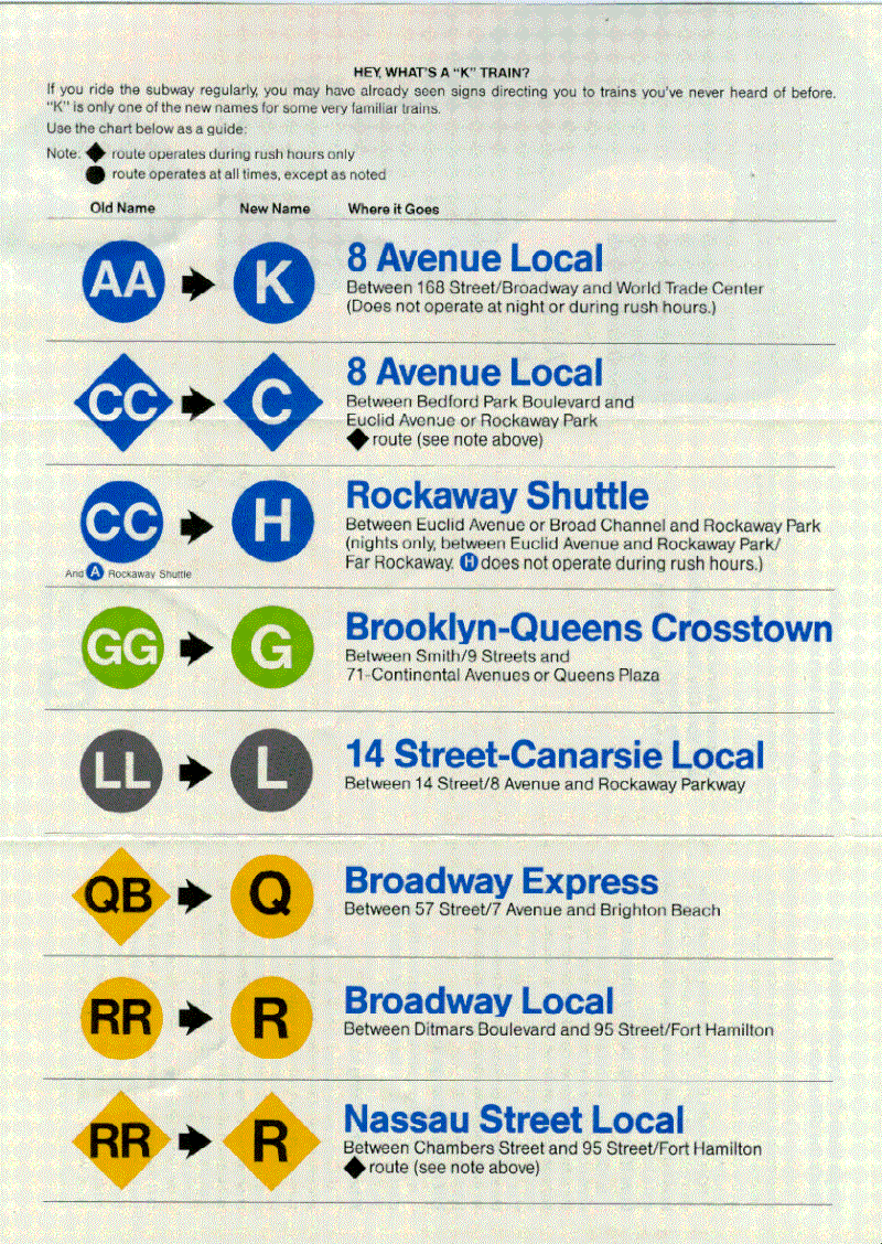 | A 1985 brochure explaining the relettering of B Division's double-letter servicces. (NYMTA) |