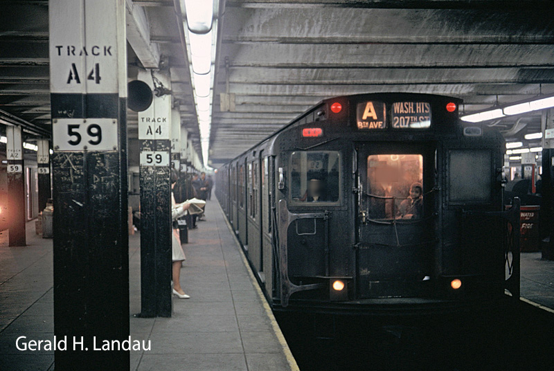 A color view of the famous "A" train, northbound to Washington Heights at 59th Street/ Columbus Circle. This is March 4, 1968. (Gerald H. Landau) |